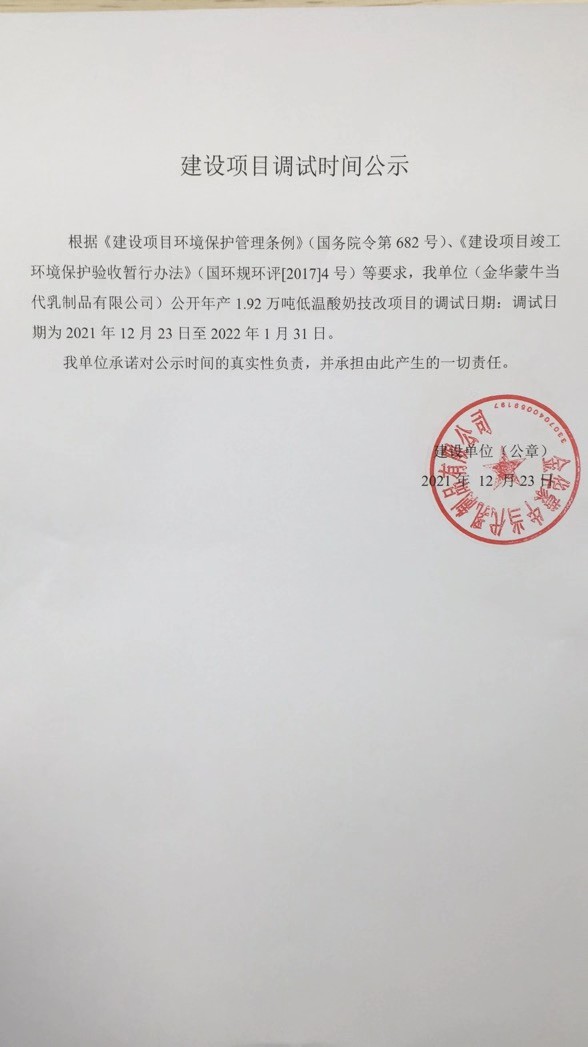 金華蒙牛當代乳制品有限公司年產1.92萬噸低溫酸奶技改項目竣工、調試時間公示